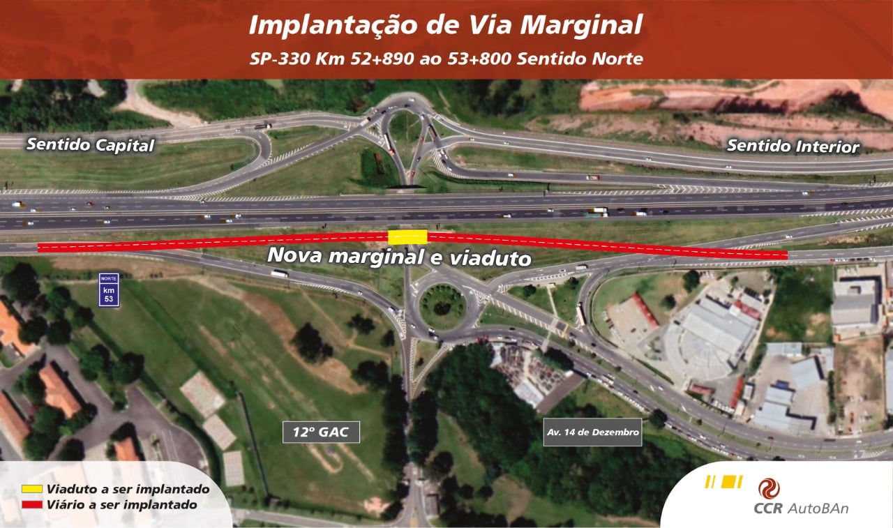 Neste trecho da pista norte – sentido interior – um novo segmento de pista marginal será construído sobre o trevo da avenida 14 de Dezembro, na altura do km 53 da SP-330. A obra acontece no gramado lateral, sem interferência ao tráfego. Além das novas pistas, com duas faixas de rolamento, um novo viaduto será implantado, paralelo ao existente (sobre o trevo da avenida 14 de Dezembro).