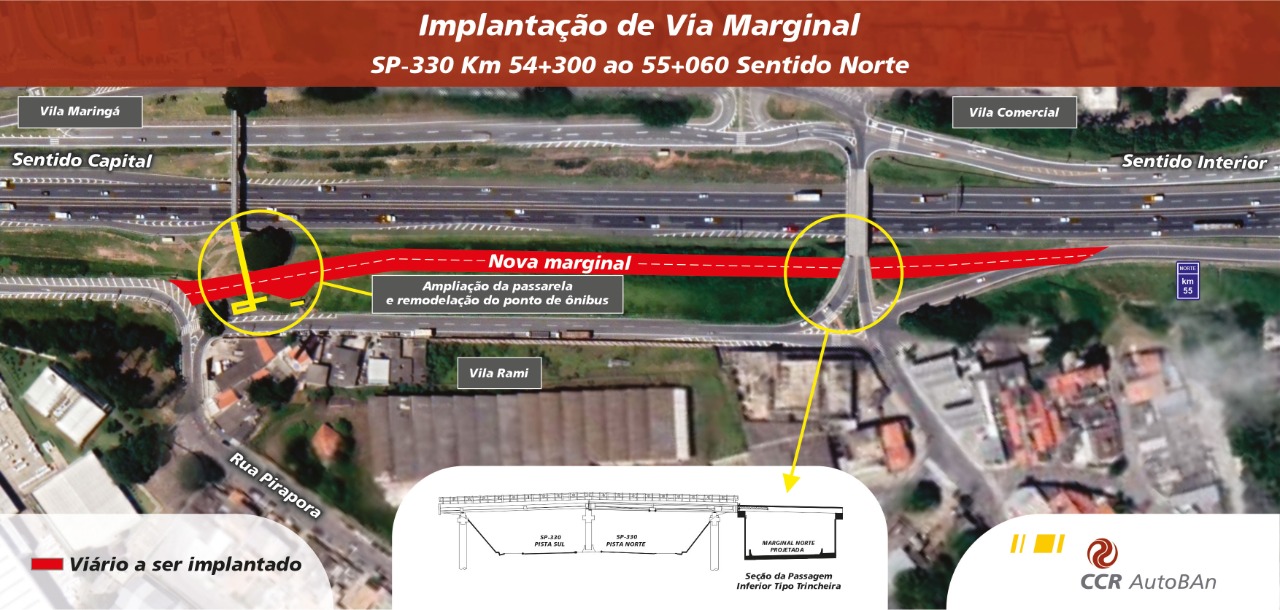 Para permitir a interligação com a marginal existente – entre a rua Bom Jesus de Pirapora e a região do km 55 da Via Anhanguera – será necessário construir uma passagem subterrânea – tipo trincheira – com duas faixas de rolamento embaixo do viaduto que faz a interligação entre os bairros Vila Maringá/Vila Comercial e Vila Rami. A passarela existente no km 54+417 será ampliada e o ponto de ônibus remodelado.