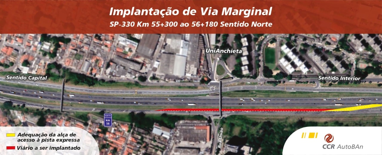 Nesta região, será implantada faixa adicional na marginal já existente. Também serão realizadas melhorias no acesso da pista marginal à pista principal, na altura do km 56+180 da SP-330. As obras não irão interferir no tráfego.