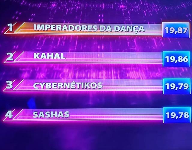 A nota final dos dançarinos de Jundiaí foi de 19,86, com nota 9,92 do auditório e 9,94 do público de casa. Já o grupo campeão Imperadores da Dança ficou com 19,87.