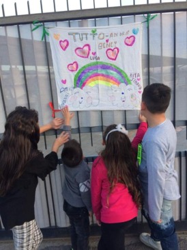 As crianças em confinamento criam desenhos de arco-íris com a frase Andrà tutto bene que quer dizer “ficará tudo bem” (foto abaixo).