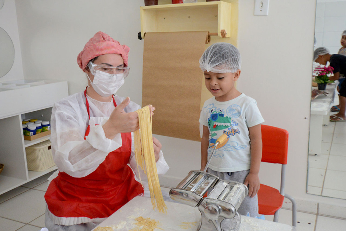Os pequenos fizeram parte de todo o processo, desde misturar e sovar a massa, cilindrar, até acompanhar o cozimento e, claro, degustar o alimento depois de pronto.. “Fui eu que fiz esse macarrão bonito, vai ficar uma delícia”, afirmou o aluno Oscar Vinícius de Paula Lima, de 3 anos, todo orgulhoso e feliz do trabalho realizado.