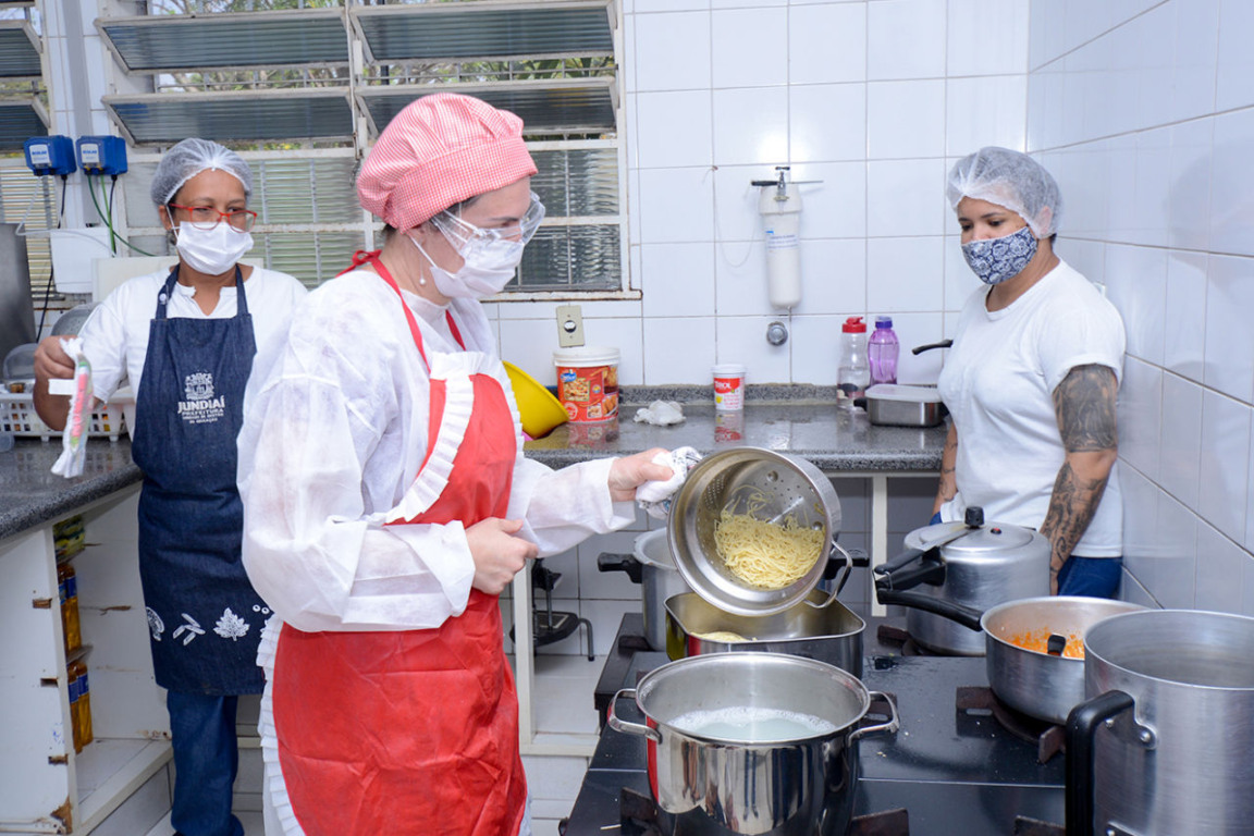 Professora Paula preparando o macarrão para os alunos (Foto: Prefeitura de Jundiaí)