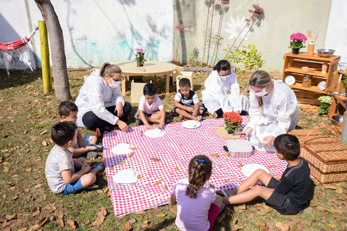 Depois que o macarrão já estava pronto, alunos e educadores saíram para a área externa da escola, onde uma toalha xadrez e pratos já o esperavam. Isaque Ferreira Rodrigues, 3 anos, provou o prato de comida, comentando os ingredientes usados na produção. “Ficou gostoso! Usamos folhas verdes, tomate e cebola”, contou.