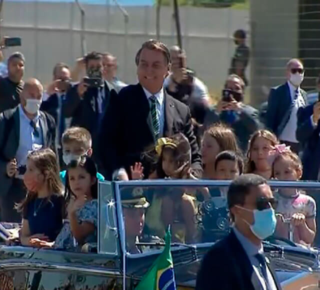 Sem máscara, Bolsonaro chegou ao local em carro aberto ao lado de pelo menos oito crianças. Apenas duas delas utilizavam o item de proteção. O Rolls-Royce (principal veículo do cerimonial da Presidência) foi acompanhado por cavaleiros do Batalhão da Guarda.