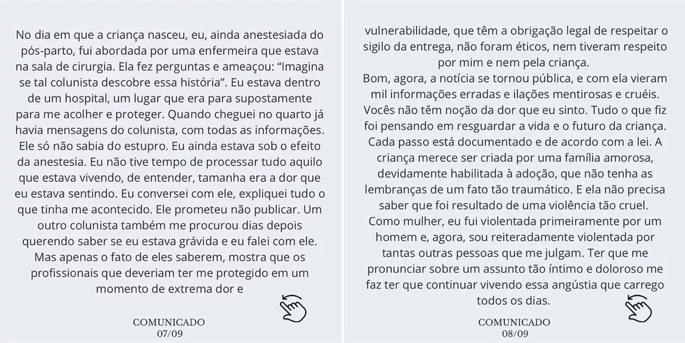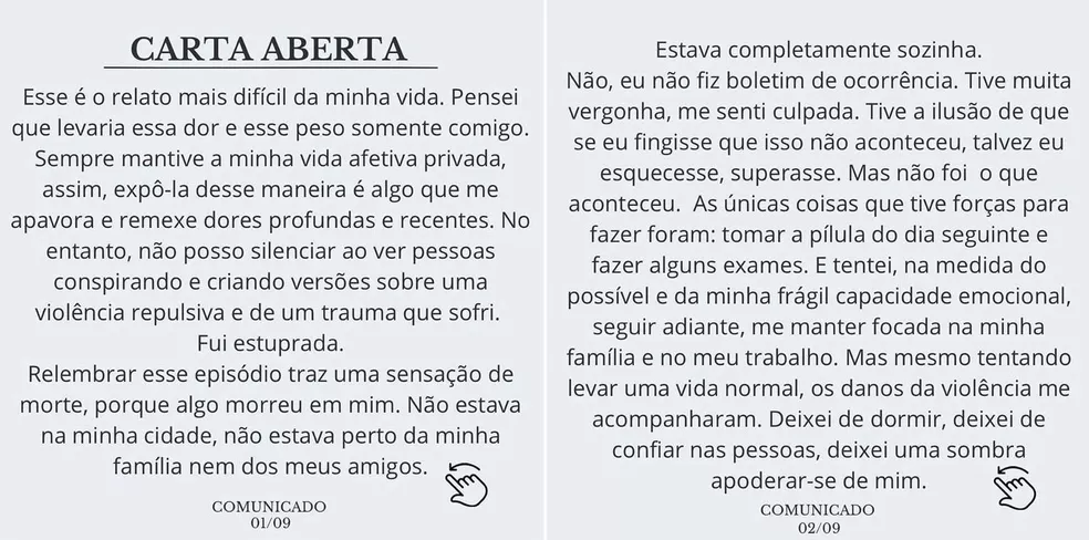 A publicação foi feita na noite deste sábado (25), após o assunto se tornar um dos mais comentados nas redes sociais. “Não posso silenciar ao ver pessoas conspirando e criando versões sobre uma violência repulsiva e um trauma que sofri”, afirma ela. “Esse é o relato mais difícil da minha vida. Pensei que levaria essa dor e esse peso somente comigo.”