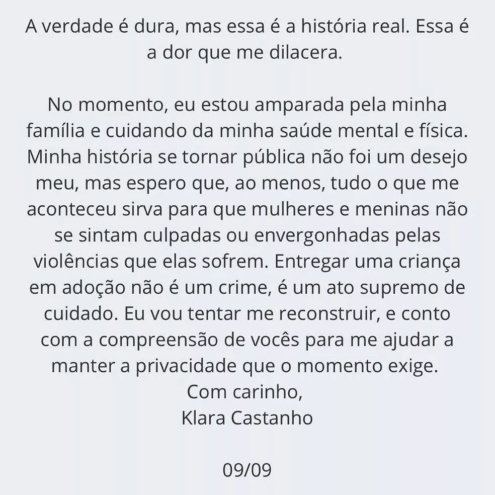 A atriz Klara Castanho, de 21 anos, publicou um relato em suas redes sociais e revelou que foi estuprada, engravidou e decidiu entregar o bebê diretamente para adoção.