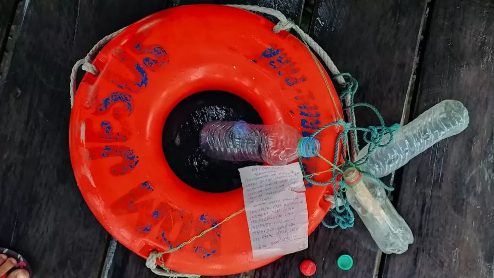 Um bilhete encontrado em garrafa pet amarrada a uma boia levou a Marinha do Brasil ao paradeiro de seis tripulantes desaparecidos.