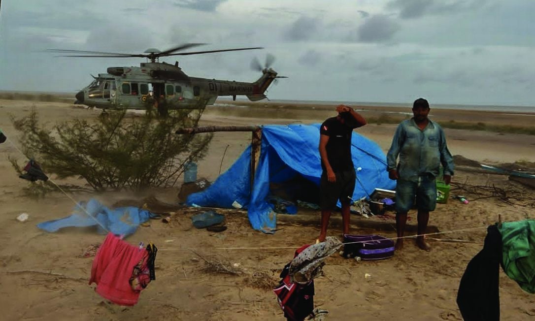 “Socorro, socorro! Precisamos de ajuda, nosso barco pegou fogo, estamos há 13 dias na Ilha das Flechas sem comida avise nossa família”.