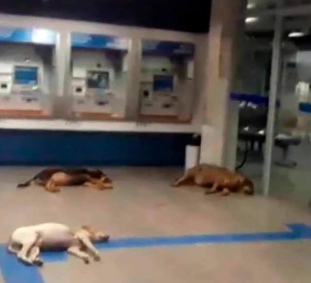 Os animais invadiram uma agência bancária da cidade e pasmem: não foi para roubá-la. Acontece que a temperatura marcava 40 graus e nem os cãezinhos foram capazes de resistir a um ar-condicionado, real motivo da invasão do local. Um morador de Ubá foi quem registrou o momento e publicou em seu perfil do Facebook, onde viralizou.