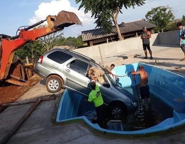 Uma criança de dois anos deu partida no carro do avô e derrubou o veículo dentro da piscina que estava em construção. O caso aconteceu em Itararé, Bauru (SP). O menino saiu sem nenhum ferimento.