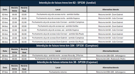 Os trabalhos serão realizados durante o período noturno para minimizar o impacto no tráfego. No entanto, podem ocorrer interdições alternadas na faixa 1 (esquerda) durante o processo, que está programado para ser concluído até o dia 8 de dezembro.
