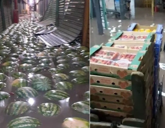 Nas redes sociais, vídeos e fotos do local circulam mostrando o prejuízo de alimentos, como legumes, frutas e verduras que foram levados pela enchente. Confira: