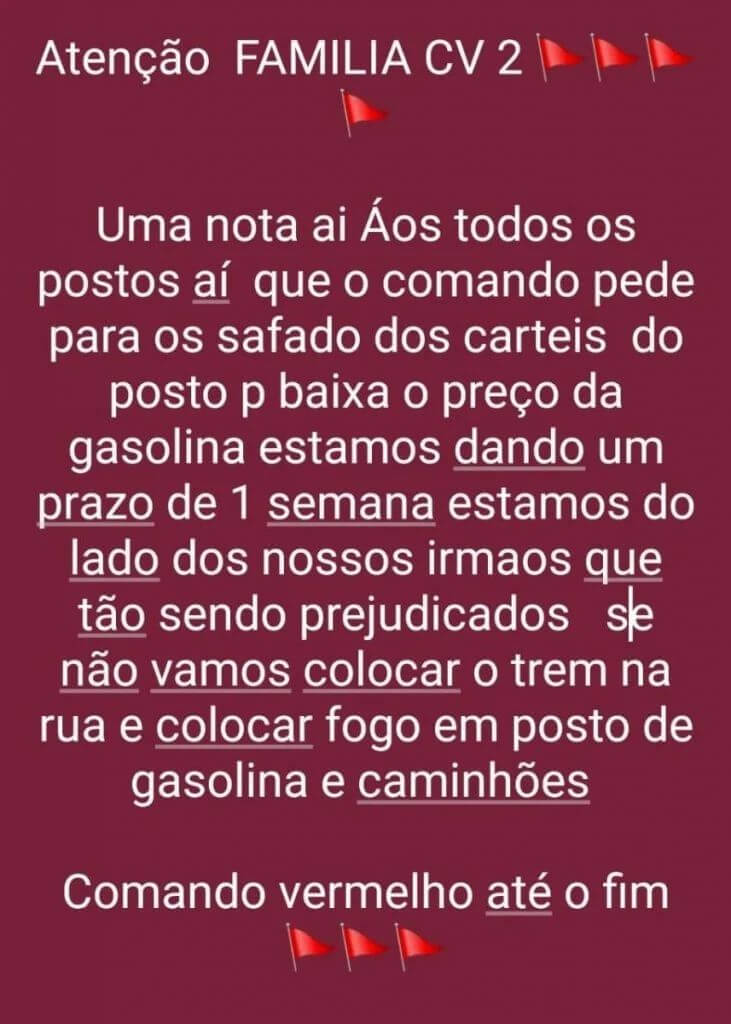 “O Comando pede para os safados dos cartéis de postos baixarem o preço da gasolina. Estamos dando o prazo de uma semana, estamos do lado dos nossos irmãos que estão sendo prejudicados. Se não [cumprirem], vamos botar o trem na rua e colocar fogo em postos de gasolina e caminhões”, ameaça o Comando Vermelho.