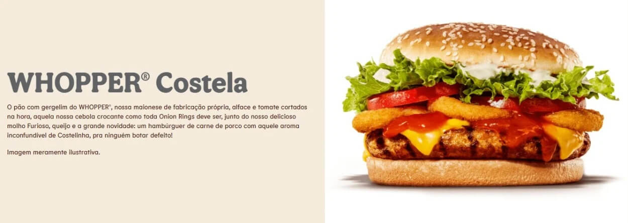 Depois de o Mc’Donalds ter admitido que o McPicanha não tem picanha na composição do hambúrguer, foi a vez do o Burger King confirmar nesta segunda-feira (02) que o seu sanduíche Whopper Costela não tem costela. O sanduíche virou alvo de reclamações dos consumidores por não tem o ingrediente que dá nome ao lanche.