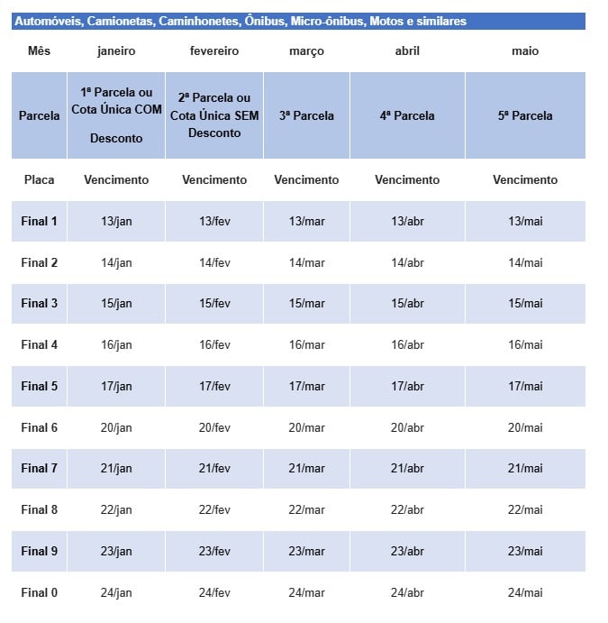 Caso o motorista opte pelo parcelamento, a Sefaz-SP padronizou os vencimentos para facilitar a memorização: todas as parcelas vencem no mesmo dia do mês, de acordo com o final da placa. Por exemplo, veículos com final de placa 1 têm vencimentos em 13 de janeiro, 13 de fevereiro, 13 de março, 13 de abril e 13 de maio. Caso a data coincida com finais de semana, feriados ou dias sem expediente bancário no município de registro, o pagamento poderá ser realizado no próximo dia útil. Veja a seguir: