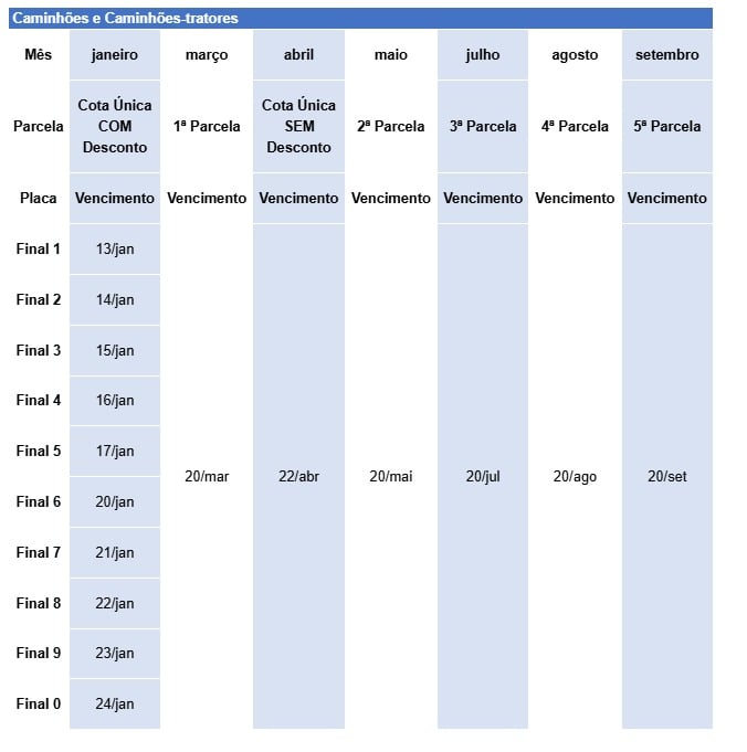 Os caminhões possuem prazos diferenciados para pagamento do IPVA. Quem optar pelo pagamento integral em janeiro terá 3% de desconto. Para pagamento em cota única sem desconto, o vencimento será em 22 de abril. Já os proprietários que escolherem parcelar o imposto em três, quatro ou cinco vezes, sem desconto, terão vencimentos nas seguintes datas: 20 de março, 20 de maio, 20 de julho, 20 de agosto e 20 de setembro. Consulte as tabelas completas abaixo:
