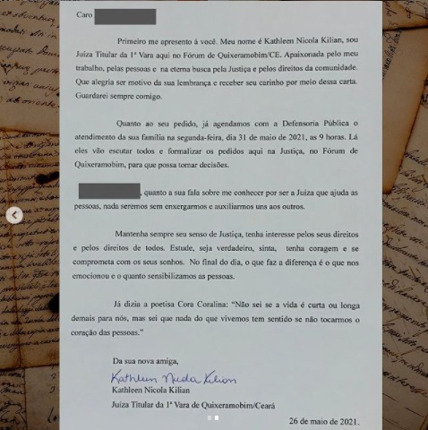 A juíza Kathleen Nicola Kilian, de Quixeramobim, no Ceará, se surpreendeu e emocionou ao receber uma carta de um menino, de oito anos de idade, que pedia para que ela o ajudasse a mudar o sobrenome para o do padrasto.