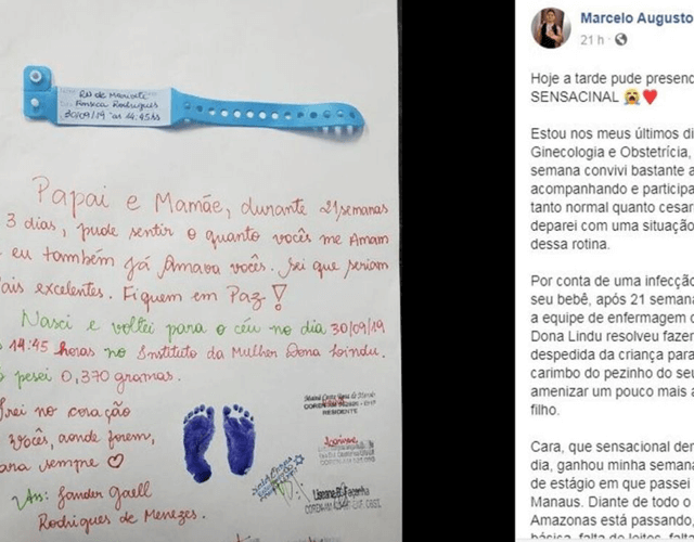 Por conta de uma infecção grave, uma mãe perdeu seu bebê após 21 semanas e 3 dias de gestação. A equipe de enfermagem do Instituto da Mulher Dona Lindu resolveu fazer essa linda carta de despedida da criança para a mãe e o pai com o carimbo do pezinho do seu bebê, com o intuito de amenizar um pouco mais a dor da perda de seu filho.