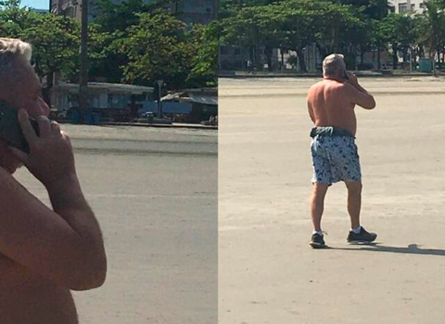 O registro foi feito na manhã desta quarta-feira (5) por uma moradora da cidade que prefere não se identificar. Segundo ela, o desembargador estava caminhando pela faixa de areia, com a máscara no pescoço, enquanto falava ao celular.