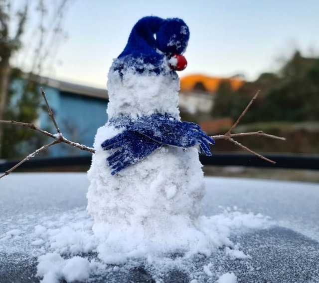 Na manhã gelada desta quarta-feira (26), com -2,54ºC nos termômetros de São Joaquim, em Santa Catarina, o fotógrafo Mycchel Legnaghi aproveitou a menor temperatura do ano e construiu um “boneco de geada”.