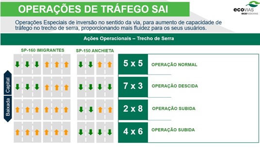 Durante o período da fase emergencial será mantida operação normal no SAI, conhecida como 5×5, quando três faixas das pistas Sul da Rodovia dos Imigrantes e duas pela Via Anchieta descem rumo à Baixada Santista; e três faixas das pistas Norte da Rodovias dos Imigrantes e duas da Via Anchieta sobem a serra em direção à capital e ao interior do Estado.