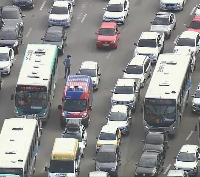 Inicialmente, o helicóptero acompanhava o congestionamento formado da BR-101 depois de uma acidente com uma carreta, pouco antes das 5h. Já eram 8h da manhã quando a lentidão se estendia por quatro quilômetros e as câmeras flagraram um homem andando entre os carros, aparentemente perdido.