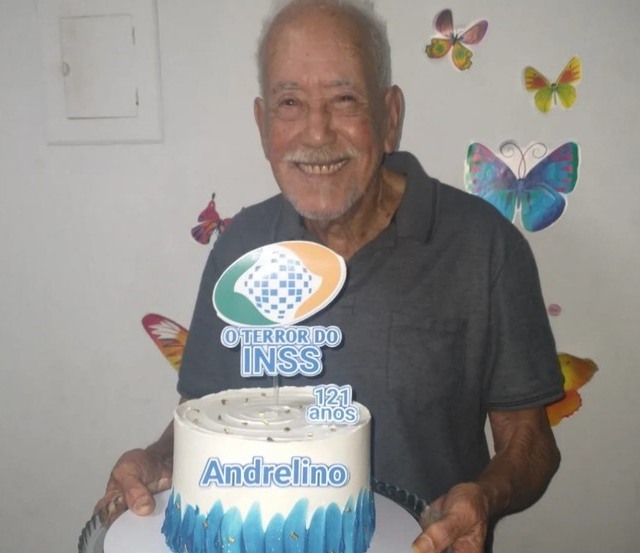 O aposentado Andrelino Vieira da Silva comemorou seu aniversário de 121 anos de idade com um bolo com o tema “O terror do INSS”. De Aparecida de Goiânia, Goiás, a neta dele, a supervisora contábil Janaina Lemes de Souza, de 36 anos, mandou fazer o doce. “Todo ano eu mando fazer um bolo para ele e nesse ano um amigo viu na internet uma pessoa que fez um bolo dessa forma e me mandou dizendo: ‘É a cara do seu avô’”, disse ao Portal G1.