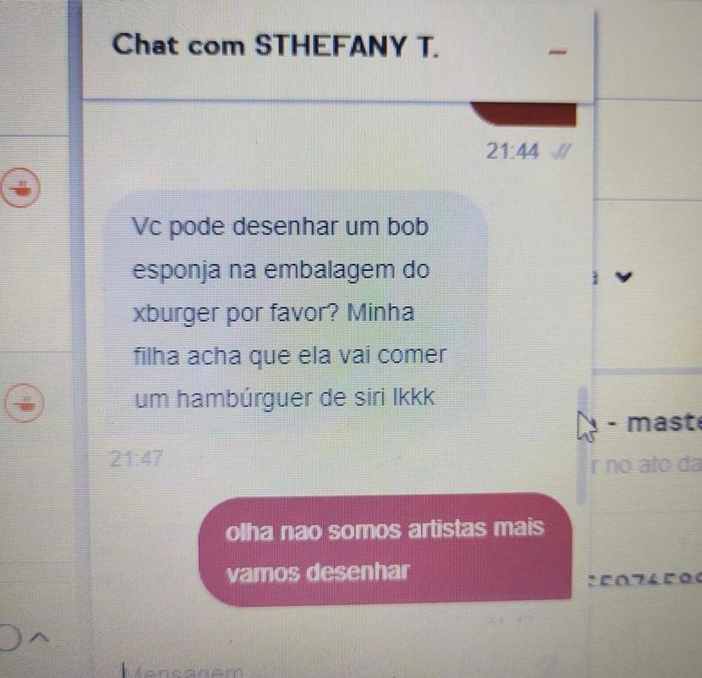 Em entrevista ao G1, Matheus contou que recebeu o pedido inusitado na semana passada e que, mesmo com o movimento na hamburgueria, desenhou o Bob Esponja que a cliente pediu. “Você pode desenhar um Bob Esponja na embalagem, por favor? Minha filha acha que vai comer um hambúrguer de siri”, escreveu a cliente. A entrega foi feita à cabeleireira Sthefany Trombiero, de Botucatu. A filha Emily tem 3 anos e, como fã de Bob Esponja, pediu aos pais se teria como comprar “hambúrguer de siri”.