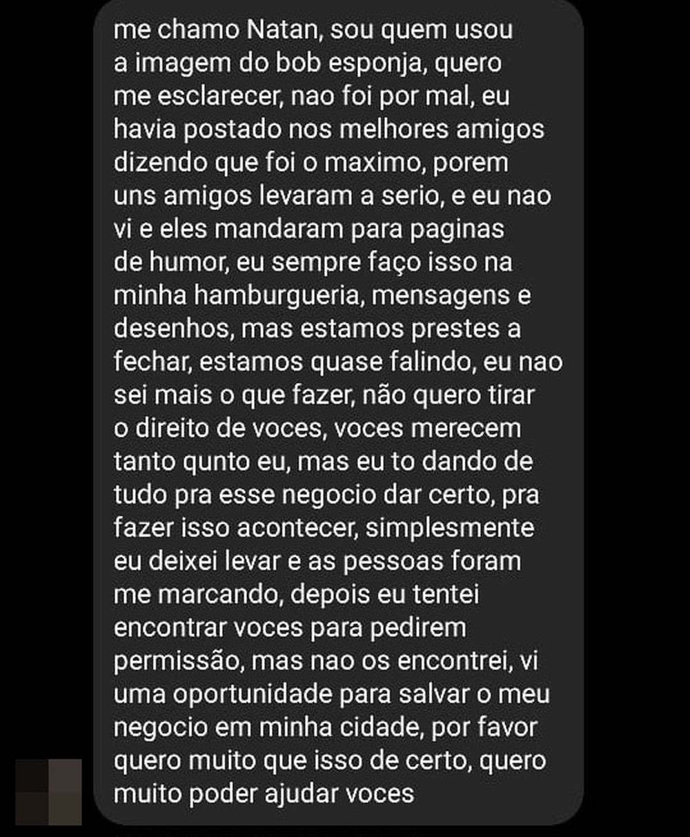 Uma hamburgueria, localizada em Botucatu (SP), reivindicou a autoria do desenho do Bob Esponja na embalagem de um lanche para uma criança que pediu um “hambúrguer de siri”. De acordo com o proprietário do local, Matheus Moreira, um empreendedor de São José do Rio Preto (SP) se apropriou das fotos dele, que viralizaram nas redes sociais.