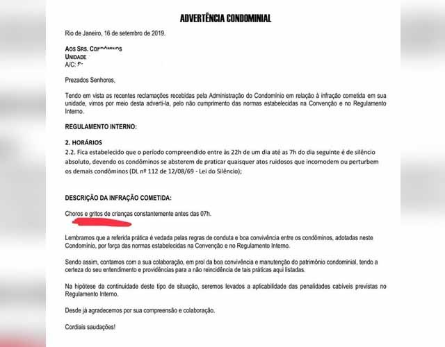 O documento do condomínio, em que Luciana mora desde dezembro de 2018, alertava ainda que, caso a situação se repetisse, ela poderia ser penalizada.