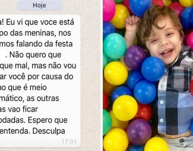 A mãe do Arthur estava em um grupo e percebeu que outras mãe conversavam sobre a festa. Ao perguntar o que seria, recebeu a mensagem da mulher e ficou tão chocada que nem sequer respondeu: “Ela era minha amiga e tenho certeza que sabia da condição do Arthur, fiquei tão triste com a mensagem que estou até agora sem ação”, desabafou na ocasião.