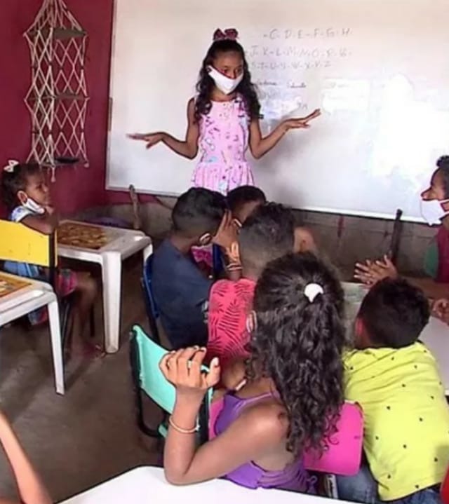 “A pandemia chegou e teve a doença e aí, a gente parou de estudar. Nós brincávamos de tarde e era divertido, só que o sol era muito quente, e eu falei assim ‘Em vez da gente brincar disso, vamos brincar de escolinha?’. Eu fui e fiz e virei professora”, disse ao G1.