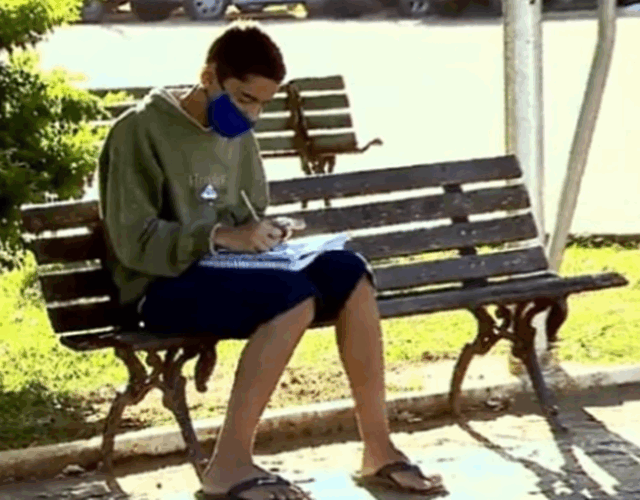 Um garoto de apenas 13 anos passa seus dias sentado em um banco de uma praça de Hidrolândia, em Goiás, para conseguir acesso à rede Wi-Fi do açougue em frente e, com isso, estudar durante a pandemia.