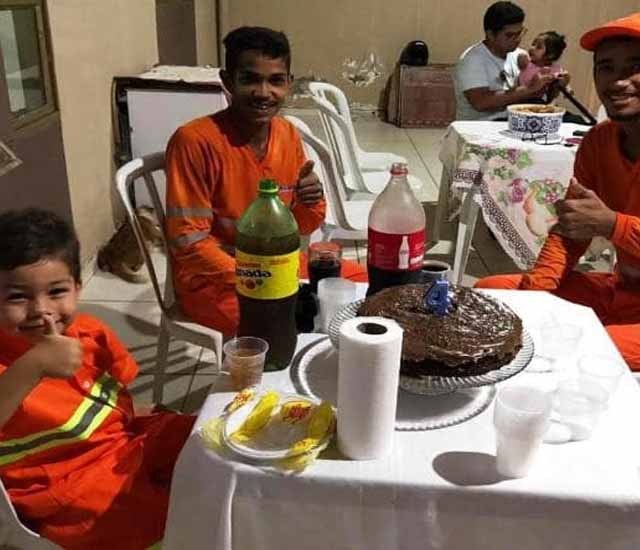 Para a festa de aniversário, Theo convidou os profissionais que coletam o lixo 3 vezes por semana no bairro em que moram.