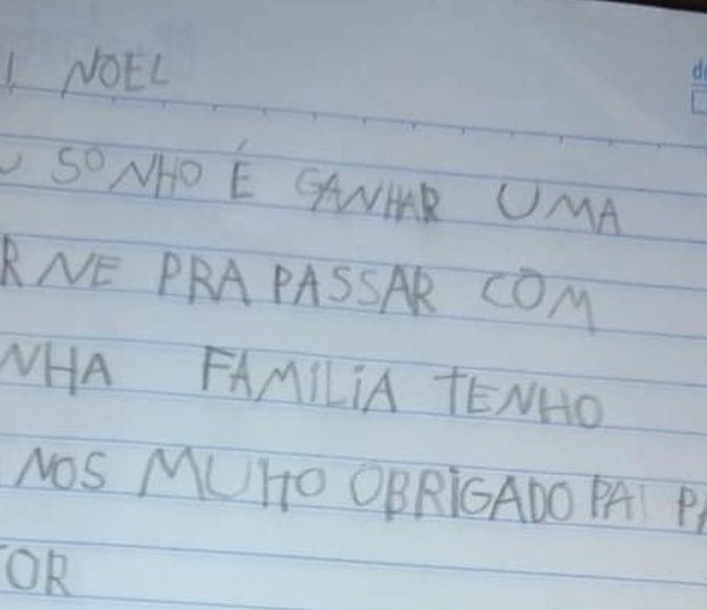 A cartinha ao Papai Noel de um menino de sete anos viralizou nas redes sociais, após, ao invés de pedir brinquedos como uma criança de sua idade normalmente deseja, ele pede carne para sua família. Hector é morador de Arroio Grande, na Região Sul do Rio Grande do Sul. “Papai Noel, meu sonho é ganhar uma carne para passar com a minha família”, escreveu o menino.