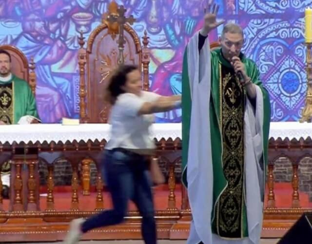 No vídeo, vemos uma mulher de camiseta branca e calça jeans invadindo o palco e empurrando o padre, que cai do local. Assista a seguir:
