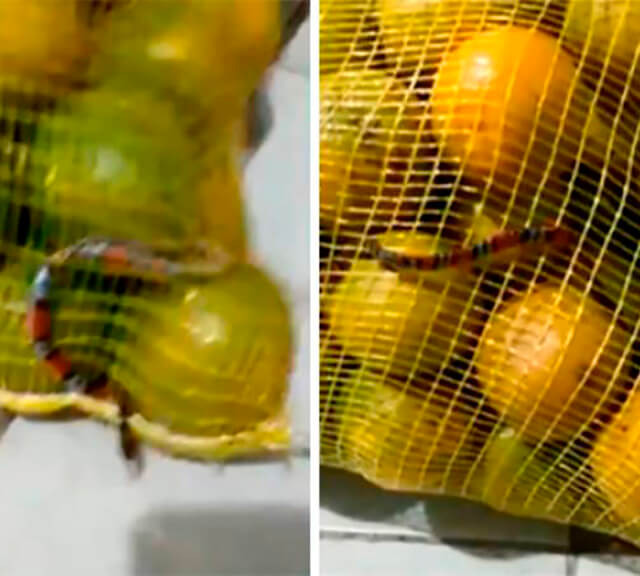 Uma mulher, identificada como Lorene, encontrou uma cobra coral dentro de um saco de 18kg de laranjas comprado em um atacadão em Mogi das Cruzes, na grande de São Paulo. As compras ficaram ao lado do filho dela, de 10 anos, durante todo o caminho de volta para a casa da família.