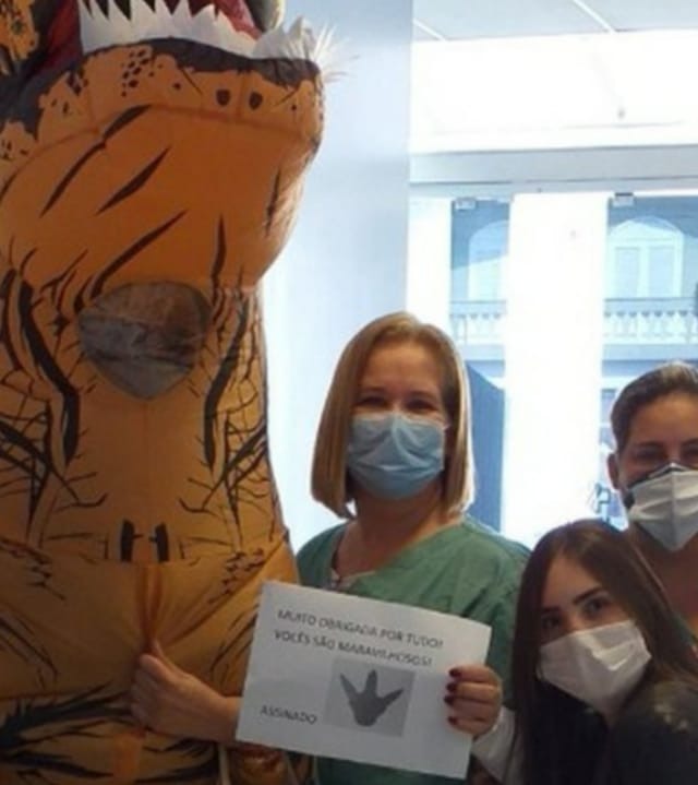 A fantasia de dinossauro foi comprada pela internet e, além dela, a mulher também usa máscara e desinfecta a fantasia depois de usar nos hospitais. Após planejar a visita por duas semanas, ela também contou com a ajuda de uma vaquinha feita pelos amigos para a fantasia e os chocolates.