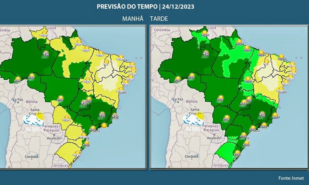A noite de Natal poderá ser chuvosa na maior parte do país. Segundo as previsões do Instituto Nacional de Meteorologia (Inmet) para este domingo (24), pancadas de chuvas e trovoadas isoladas são esperadas em diversas capitais das regiões Norte, Centro-Oeste, Sudeste e Sul.