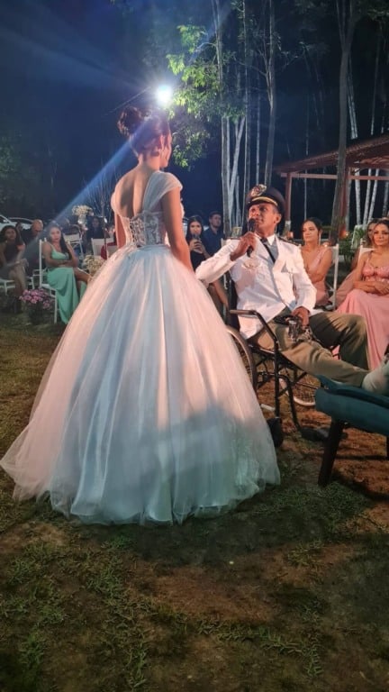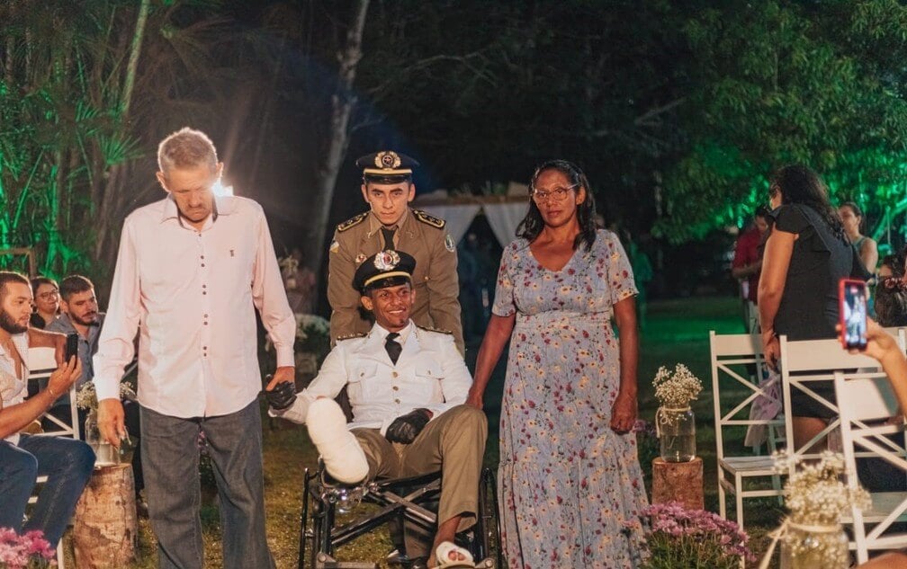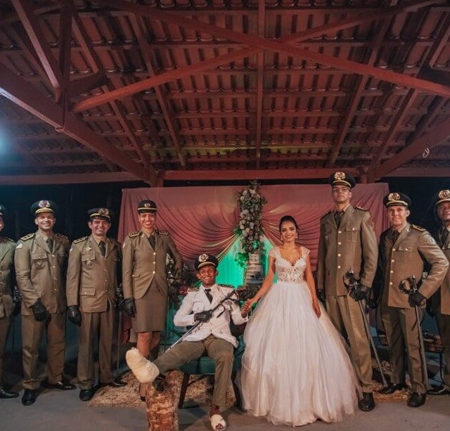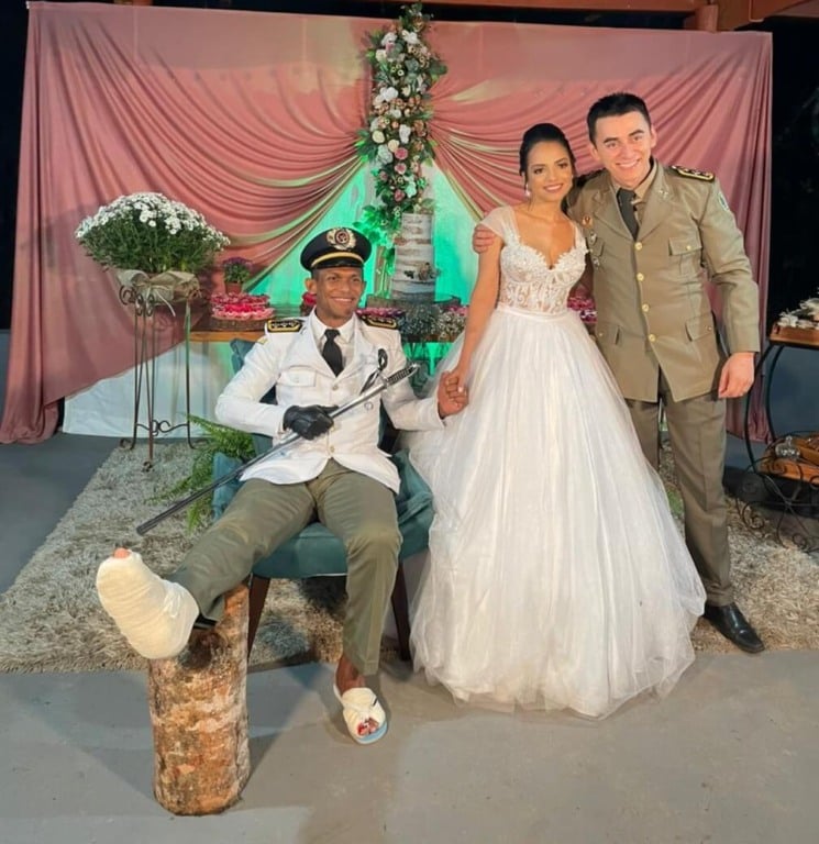 “Foi uma saga. Ele foi socorrido pelo Samu, se manteve consciente e falava o tempo todo que queria casar naquele dia, independente de qualquer coisa. Deu entrada no centro cirúrgico, foi imobilizado, fez uma cirurgia de limpeza e médicos disseram que ele precisa de mais um procedimento. Ele foi pra cerimônia e saiu do casamento direto para o hospital. Foi uma solenidade emocionante, cheia de expectativas e superação”, disse o padrinho.
