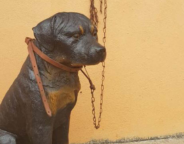 O animal de plástico fica na casa de um casal de idosos, na zona rural, que afirmaram que essa é uma estratégia para espantar possíveis bandidos que possam tentar entrar na casa deles.