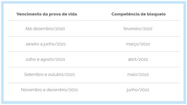 A não realização da prova de vida tem como resultado o cancelamento imediato do benefício. Antes disso há duas etapas: bloqueio e suspensão do pagamento. Quem tiver o benefício suspenso em fevereiro entrará na etapa de suspensão três meses mais tarde. Se ainda assim não atualizar os dados nessa segunda etapa, o benefício será cancelado.