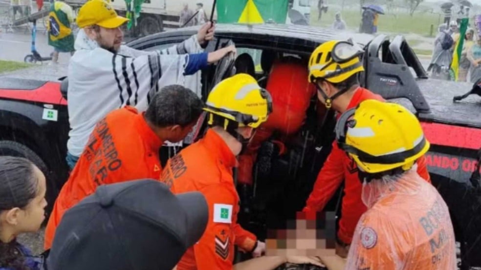 Um raio atingiu um grupo de manifestantes na área central de Brasília, na tarde deste domingo (25), durante um forte temporal que surpreendeu os participantes do ato. O incidente ocorreu nas proximidades do Memorial JK, no Eixo Monumental, onde os manifestantes aguardavam a chegada de uma passeata em apoio ao ex-presidente Jair Bolsonaro.