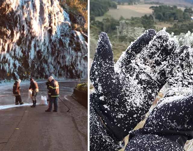 A rodovia da Serra do Rio do Rastro segue interditada nesta manhã por gelo na pista.