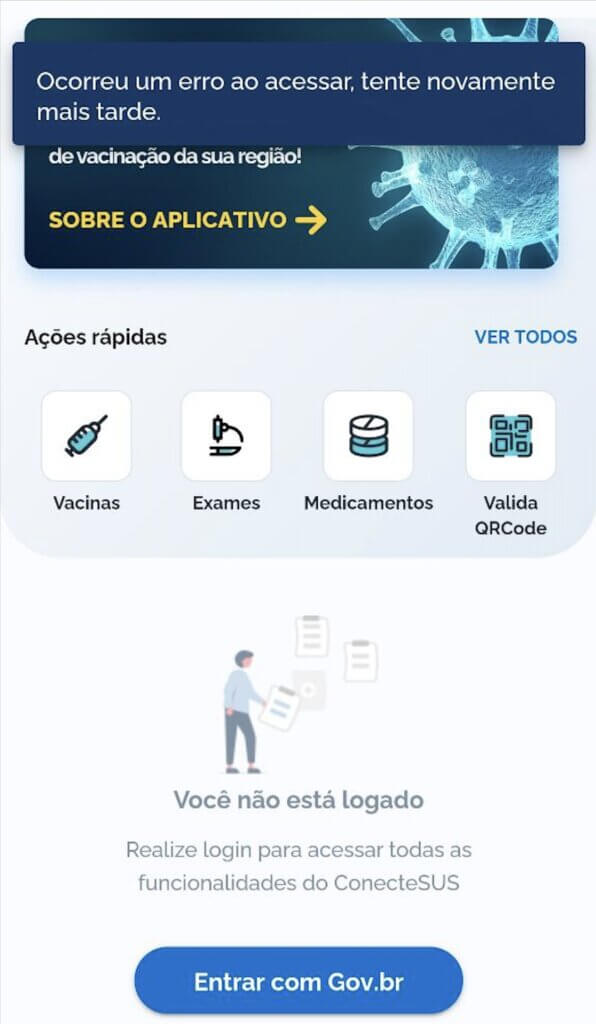 Ficou fora do ar a página principal do ministério (saude.gov.br), e além disso outros portais que são comandados pela pasta, como o ConecteSUS (conectesus.saude.gov.br) e o Portal Covid (covid.saude.gov.br) saíram do ar, inclusive os aplicativos para celular.