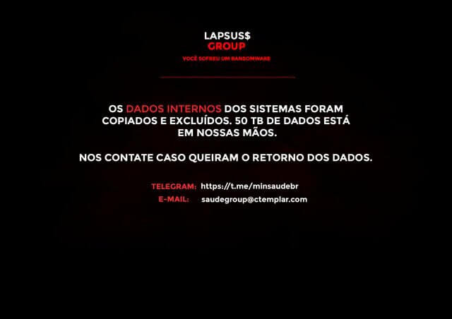 Os sites, aplicativos e sistemas do Ministério da Saúde sofreram ataque de hackers na madrugada desta sexta-feira (10). Ao tentar acessá-los, uma mensagem que foi assinada pelo Lapsus$ Group informando que “os dados internos dos sistemas foram copiados e excluídos” e orientando entrar em contato para resgate.
