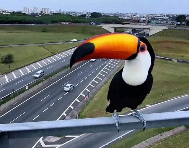 Na tarde do último sábado (11), na Via Anhanguera (SP-330), em Campinas (SP), a câmera de monitoramento flagrou um tucano na estrutura, onde permaneceu quase por um minuto.