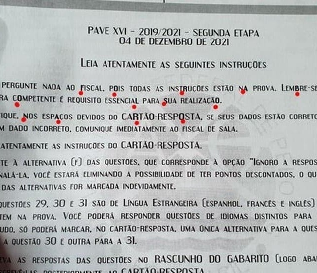 A administração da Universidade tomou conhecimento, no último domingo (5), de inclusão em sua prova do Programa de Avaliação da Vida Escolar (PAVE) de formatação de caracteres em negrito compondo mensagem de cunho político na folha de instruções.