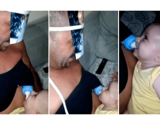 “Minha esposa precisou sair e chegou a hora do pequeno Vinícius amamentar. Ela deixou um leite na geladeira, o leite materno que ela tirou do peito dela. Só que na posição que eu colocava, Vinícius não queria. Então eu achei que a ideia de colocar um sutiã, colocar a mamadeira dentro do sutiã e colocar a foto da mamãe no meu rosto, botar ele na posição deitado, ele ia aceitar. E deu certo, ele aceitou”, contou.